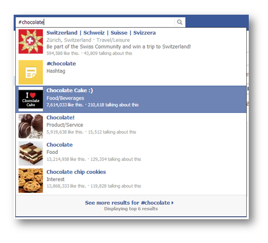 The search will bring up the top 6 results. You then can choose to select one of them or see more results. This seems to list pages to ‘Like’ and not posts. However if you select the #chocolate Hashtag (second entry) you get to see posts containing the hashtag.