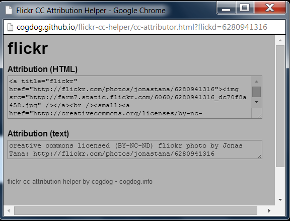 It is important to attribute the creator of any images used. To make this task easier CogDog has created a bookmarklet that you can add easily to your browser.