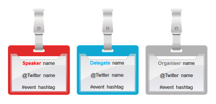 Event badges: Add the twitter username of attendees (speakers, delegates and organisers) and the event hashtag to name badges. This helps to highlight who is presenting and those involved in organising the event.