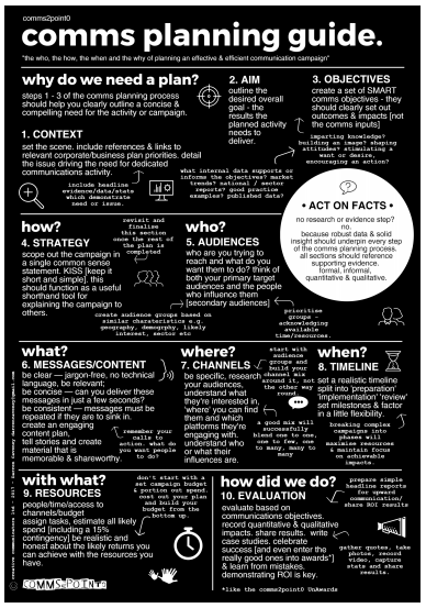 Comms2Point0 have generously shared this free download of a step by step guide to ‘the who, the how, the when and the why of planning an effective and efficient communication campaign’.