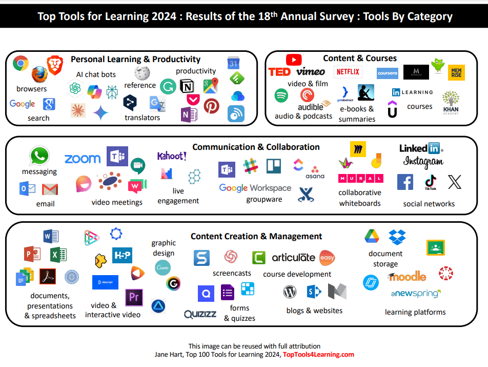 Jane Hart has conducted an annual poll on the Top 100 Tools for Learning. The results of the 18th survey were published on 2 September 2024.