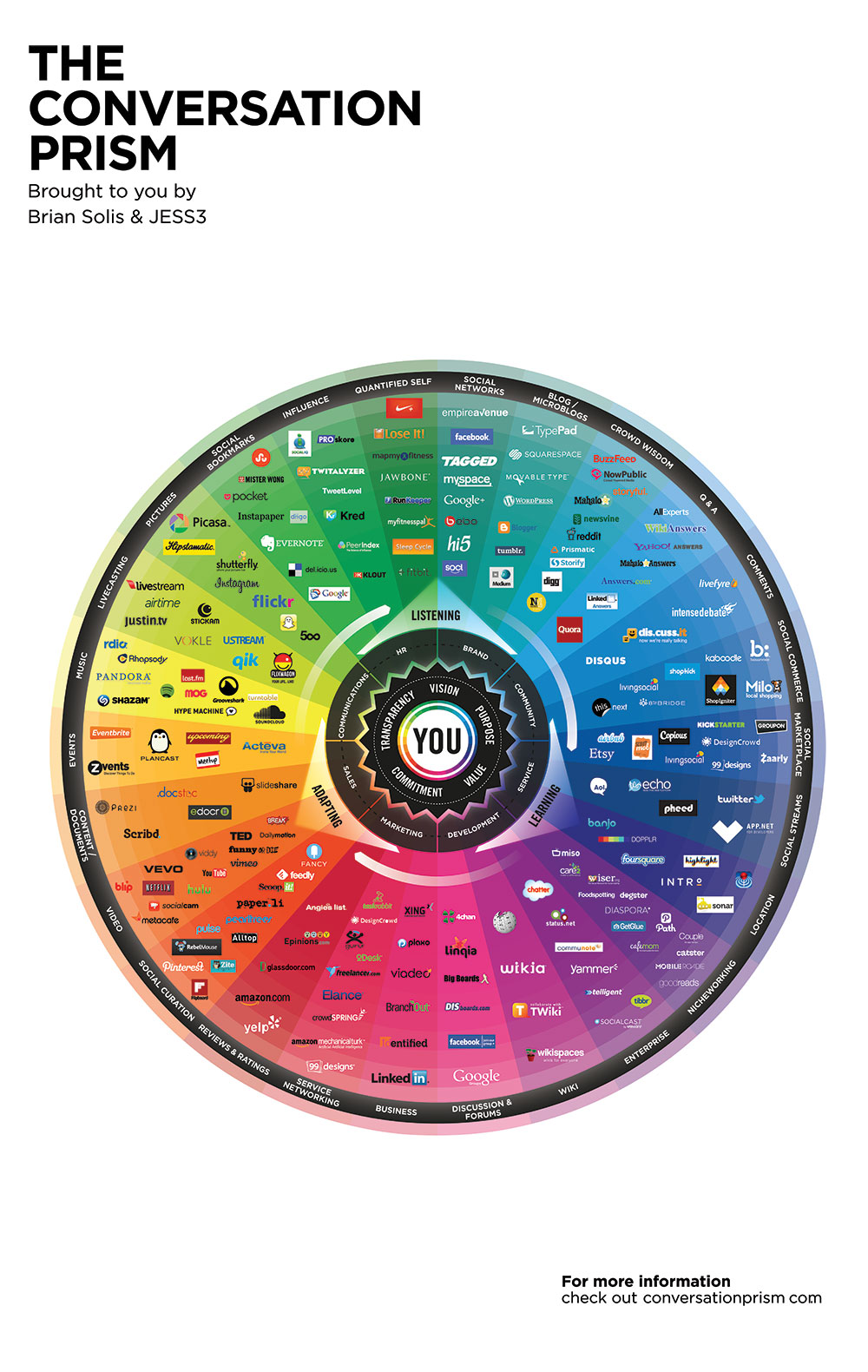 The Conversation Prism by Brian Solis and JESS3 is an infographic that demonstrates just some of the wide variety of social media tools that are available.