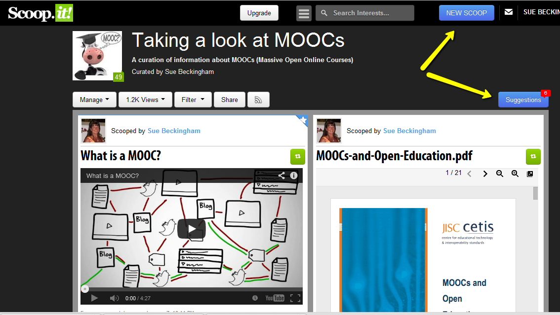 The example below is a curation about MOOCs (Massive Open Online Courses). You can add new scoops by looking at suggestions made for your topic, re-scoop other people’s articles or add the url by clcicking on ‘new scoop’.
