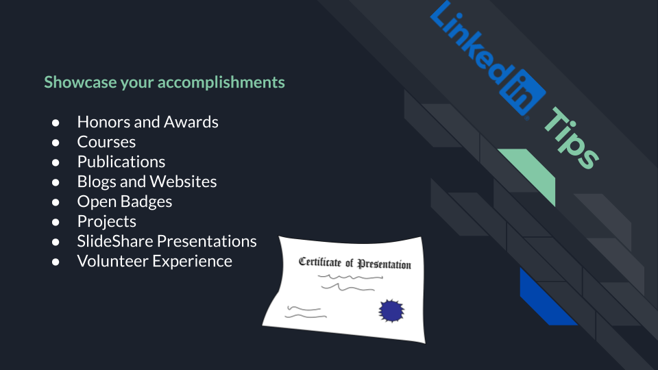 Many use LinkedIn is a space to hold their online CV using the Experience and Work sections. In addition to this there is the potential to add further sections to showcase achievements such as presentations, publications and projects. There is also the opportunity to share links to your blog or website if you have one.