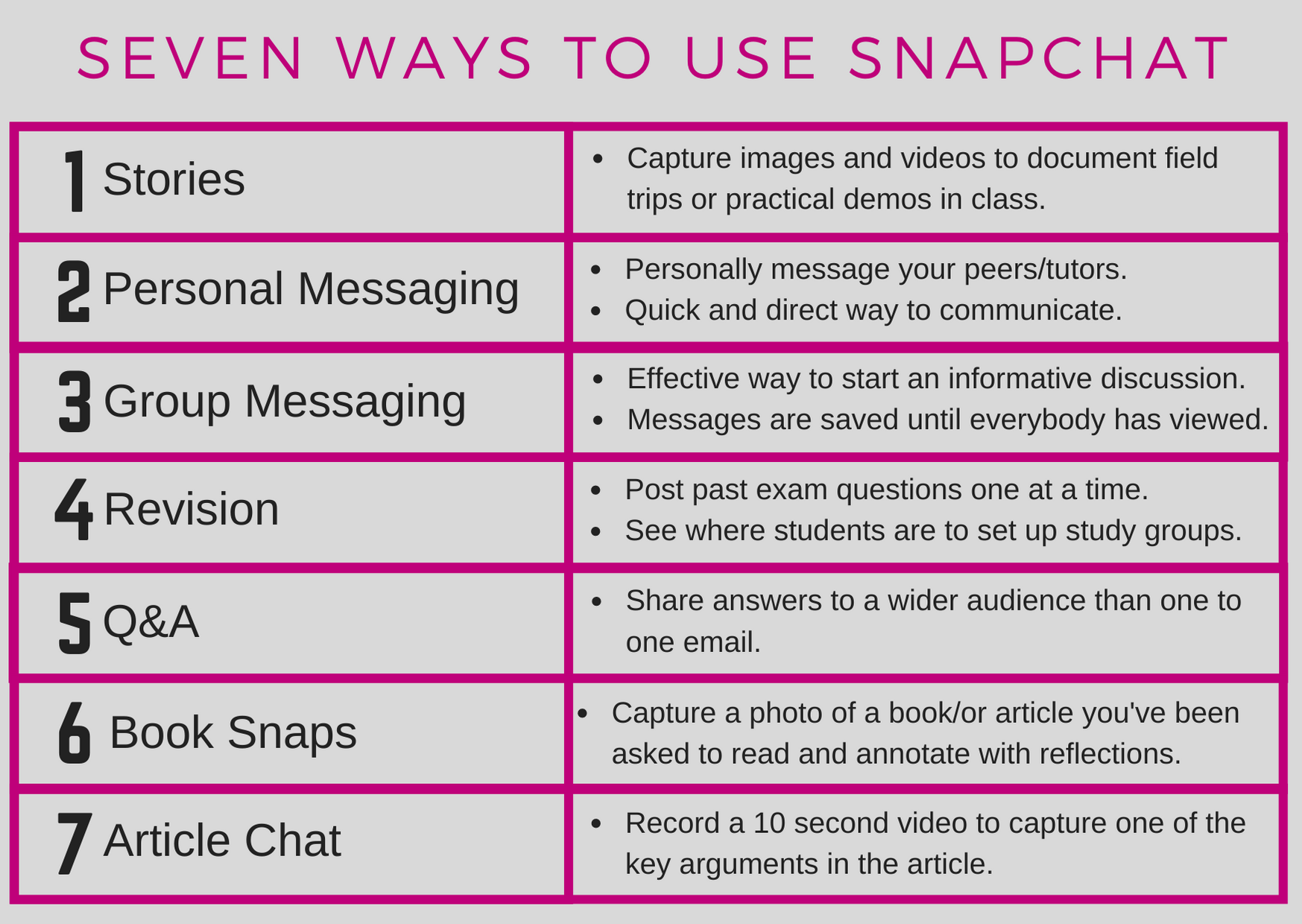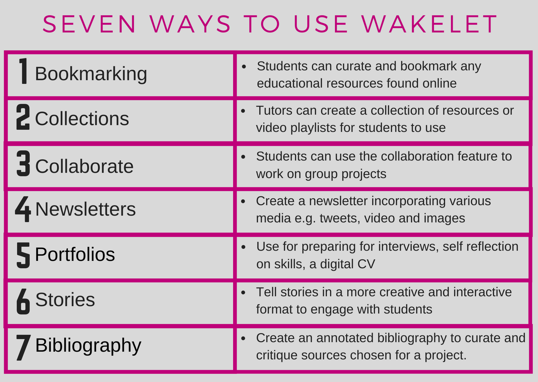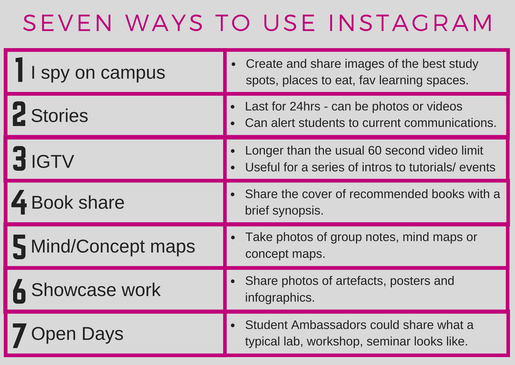 This card set takes a range of social media tools in turn and demonstrates seven ways in which each can be used for learning and teaching. They were printed as A6 double side cards and used as a discussion point in Social Media for Learning workshops where both staff and students were invited to attend.