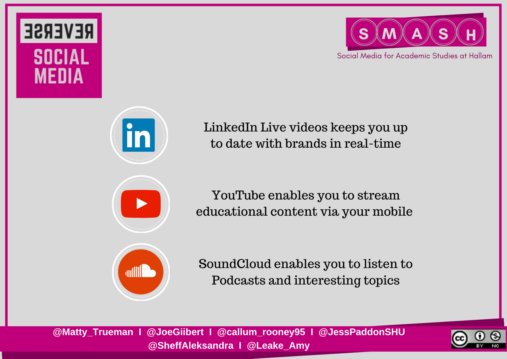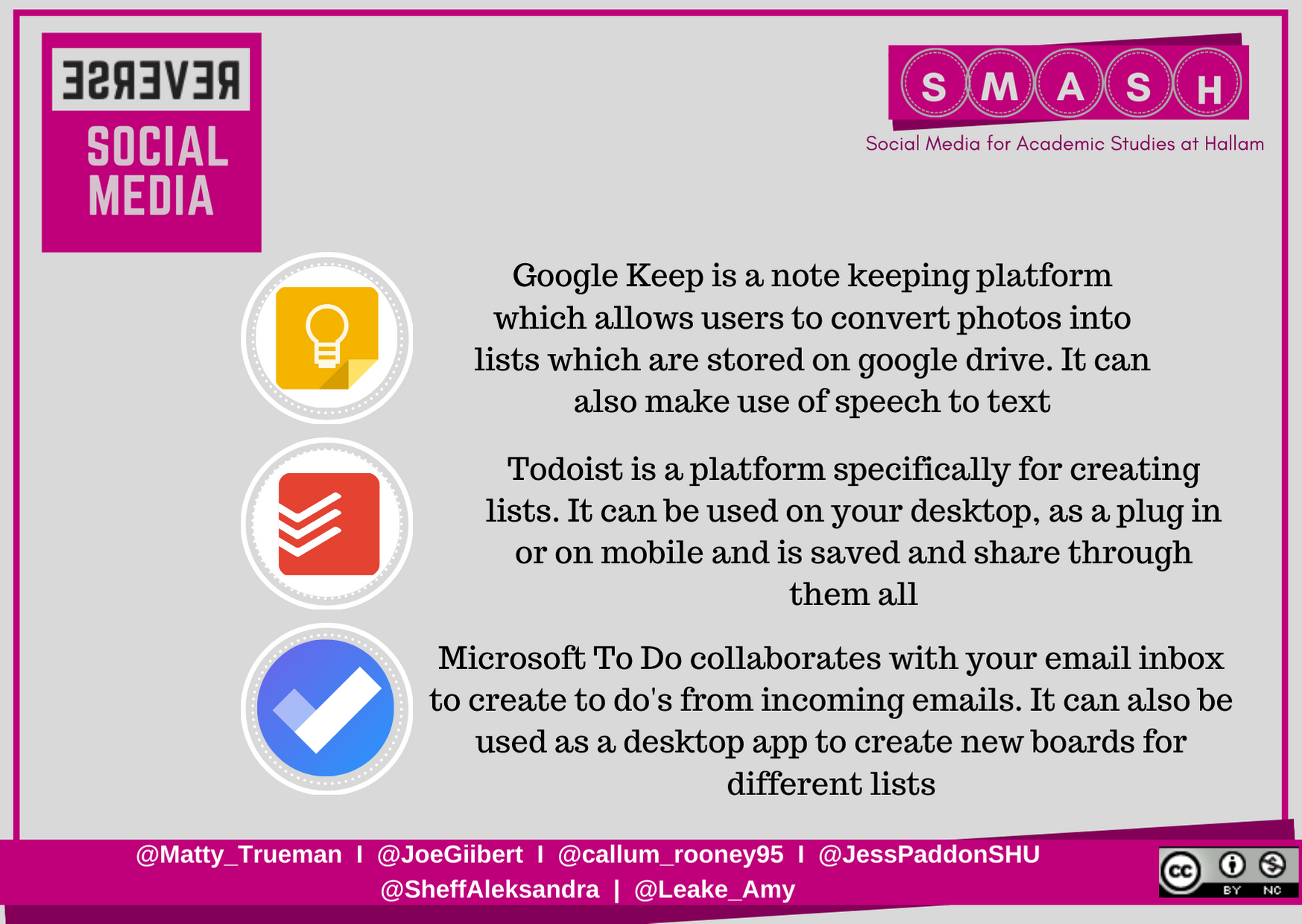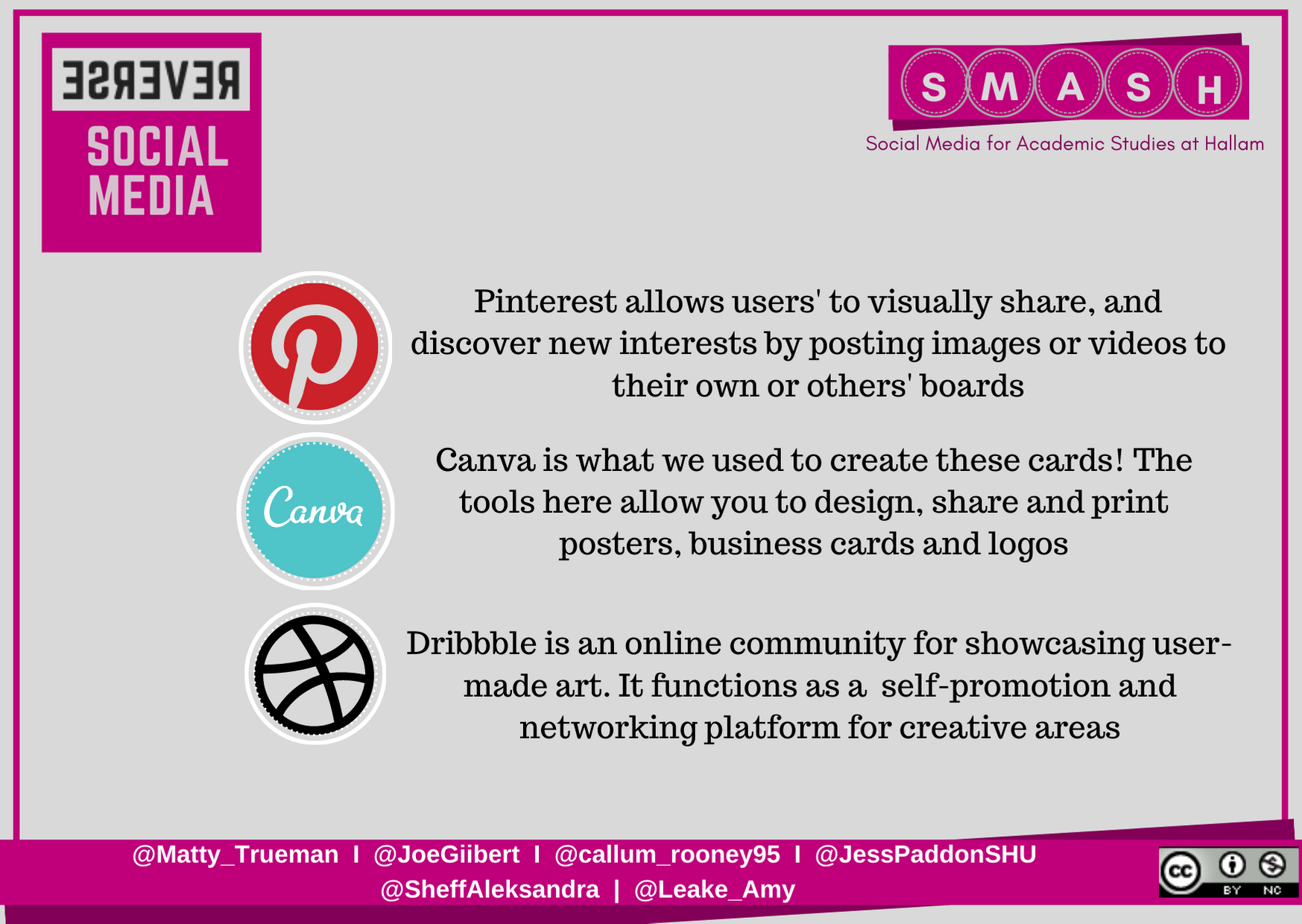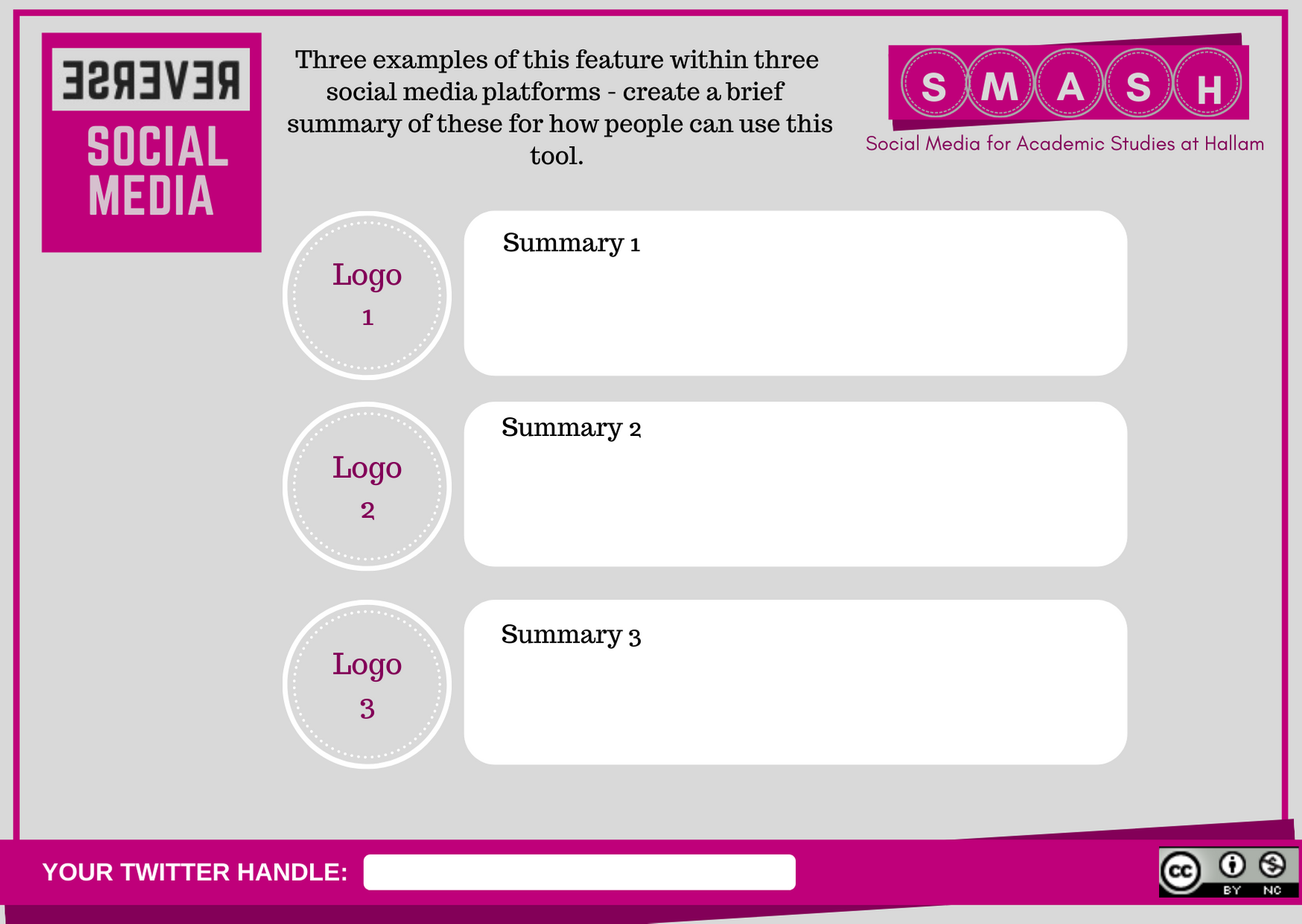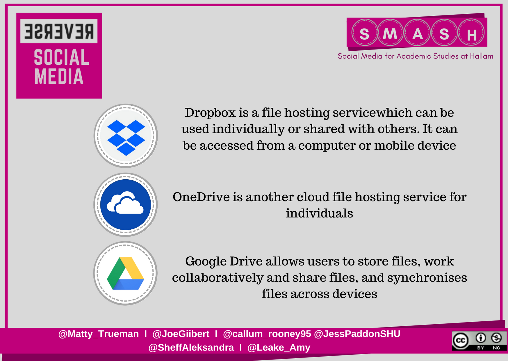 This card set considers what you want to achieve first and then offers examples of tools to help you do this. They were printed as A6 double side cards and used as a discussion point in Social Media for Learning workshops where both staff and students were invited to attend.